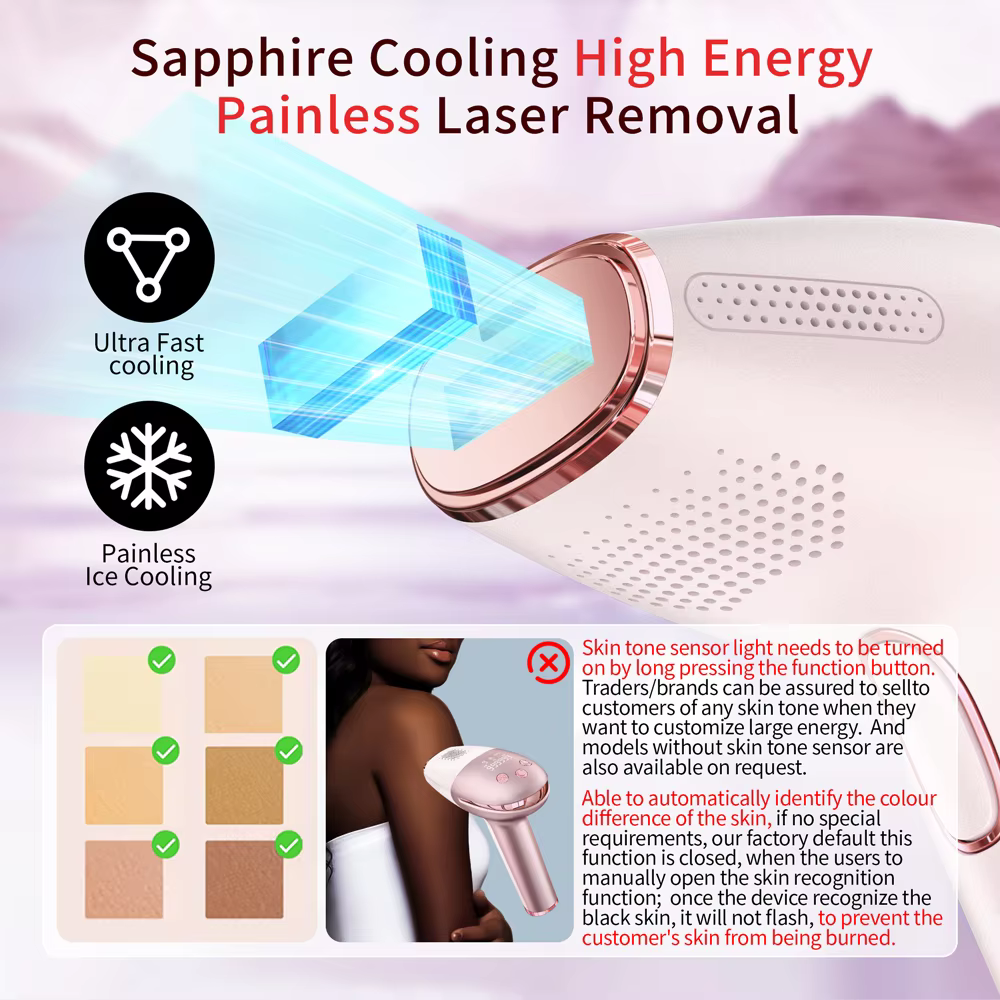 - স্যাফায়ার আইস-কুলিং প্রযুক্তি: স্যাফায়ার কুলিং হেড দিয়ে চিকিৎসা সম্পূর্ণ ব্যথাহীন ও আরামদায়ক হয়। অন্যান্য ডিভাইসে যে তাপ ও পোড়ার অনুভূতি থাকে, তা থেকে আপনার ত্বককে সুরক্ষা দেয়।